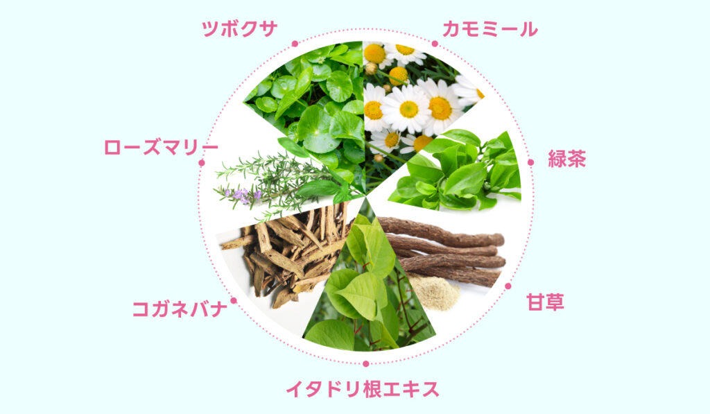 ※4ツボクサ、ローズマリー、コガネバナ、イタドリ根エキス、カモミール、甘草、緑茶